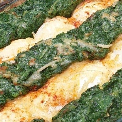 Met aardappelpuree, spinazie, ei en kaassaus.